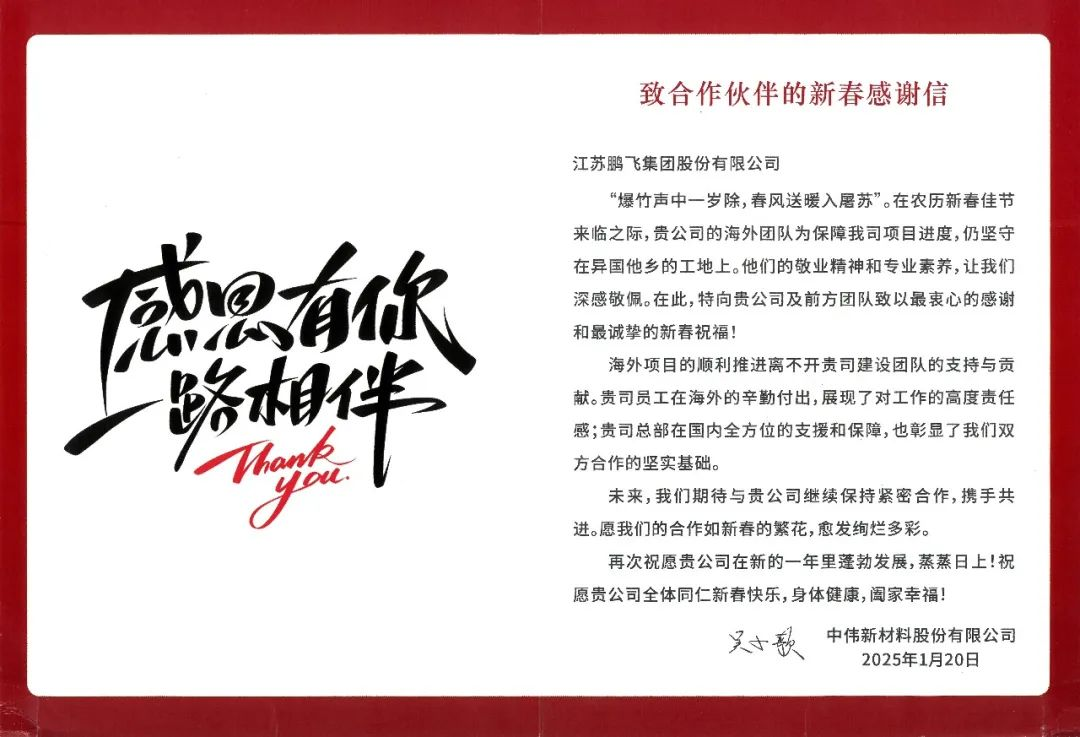 江蘇鵬飛集團(tuán)在項(xiàng)目履約中用行動(dòng)做到客戶(hù)滿(mǎn)意,以?xún)?yōu)質(zhì)履約作為品牌支撐,收到來(lái)自客戶(hù)的感謝信。信中,客戶(hù)對(duì)我司交付的項(xiàng)目質(zhì)量和效率表達(dá)了高度肯定和認(rèn)可,更對(duì)鵬飛項(xiàng)目負(fù)責(zé)團(tuán)隊(duì)的認(rèn)真負(fù)責(zé)態(tài)度、專(zhuān)業(yè)技術(shù)能力、高效執(zhí)行能力給予了高度的評(píng)價(jià)和贊賞。