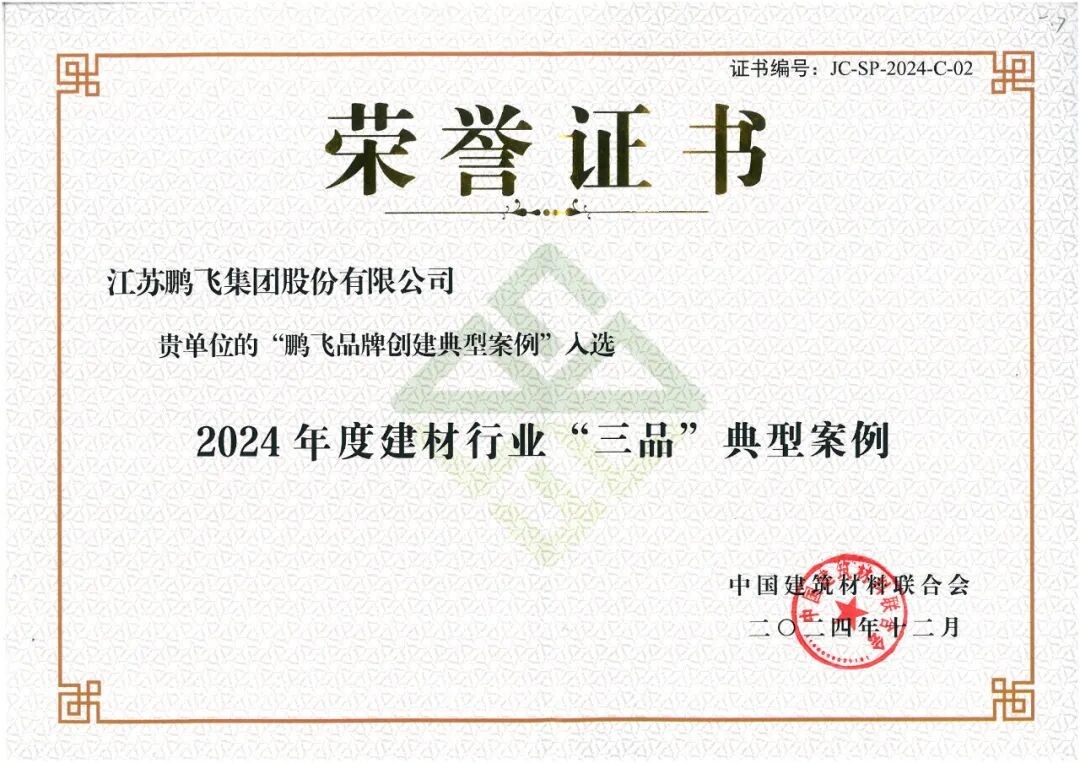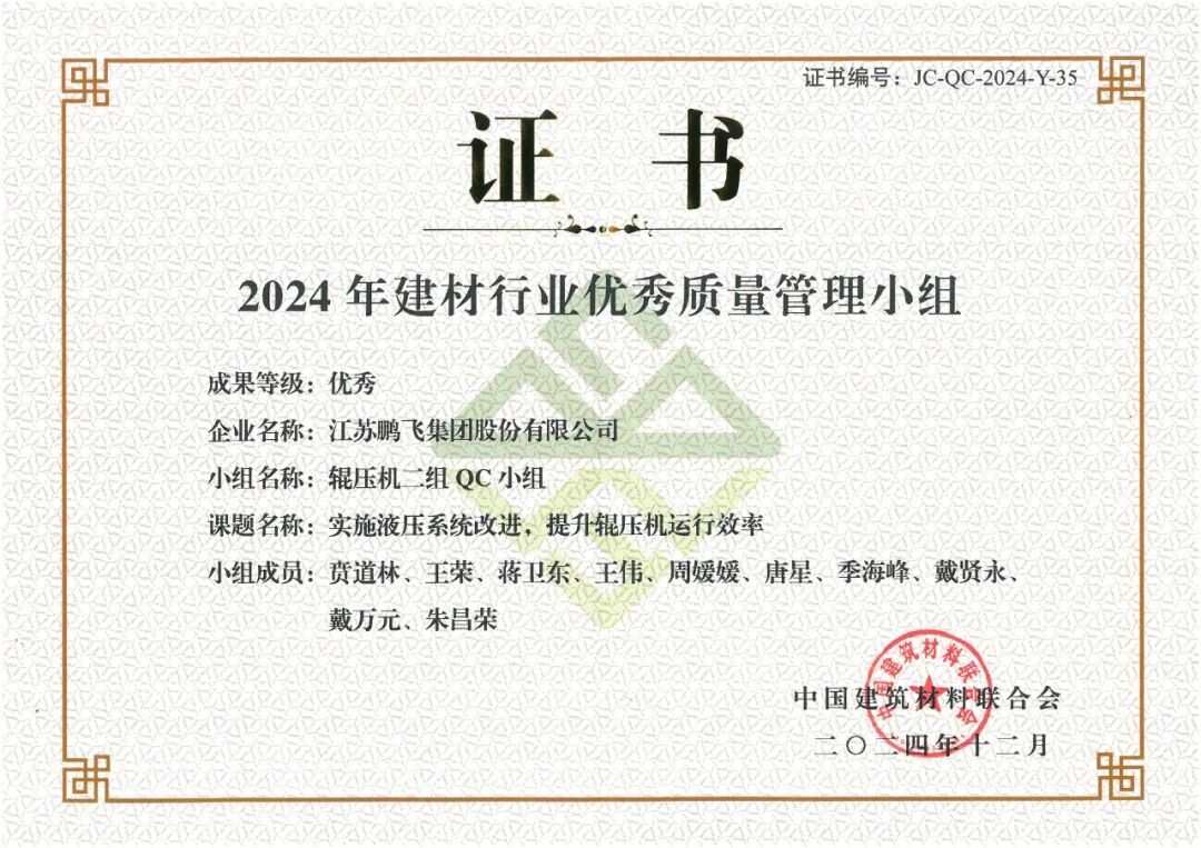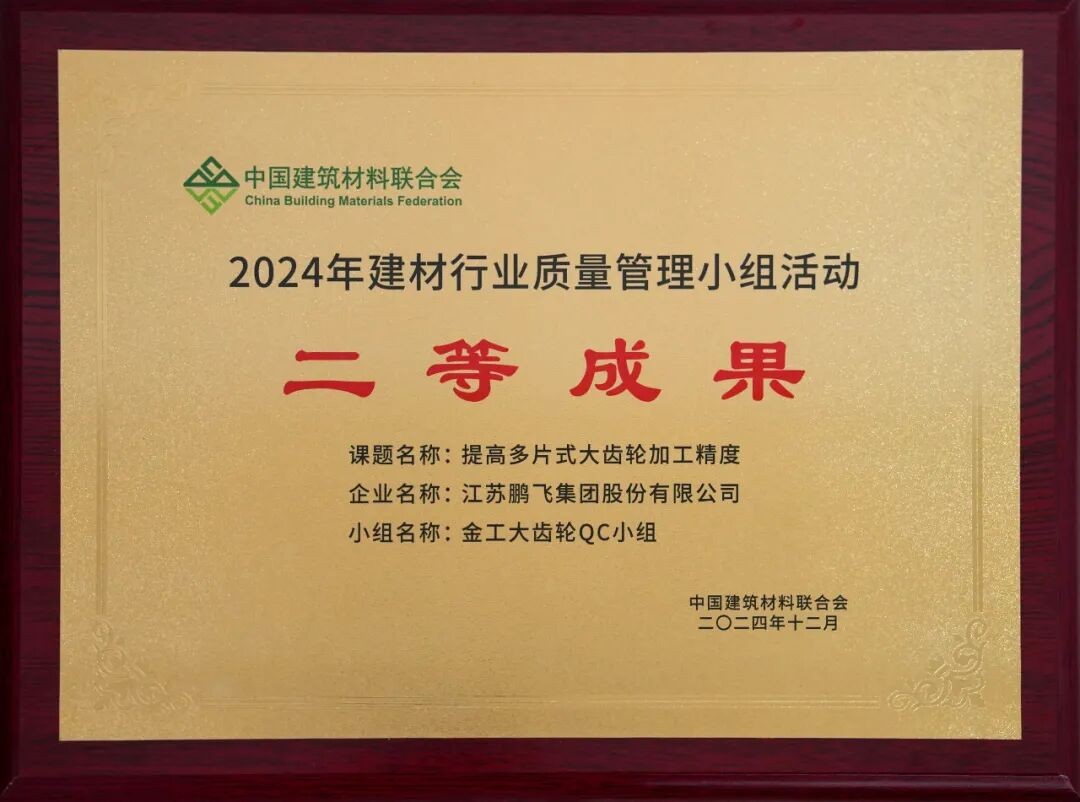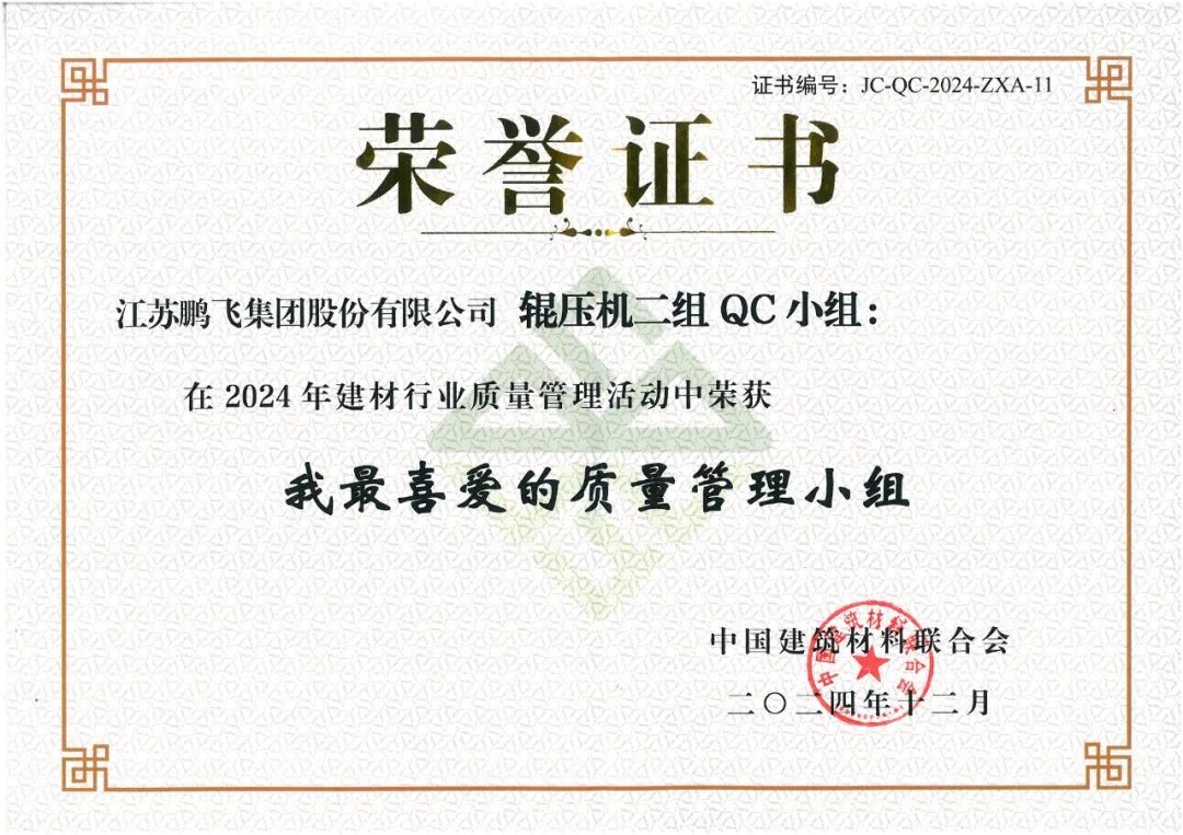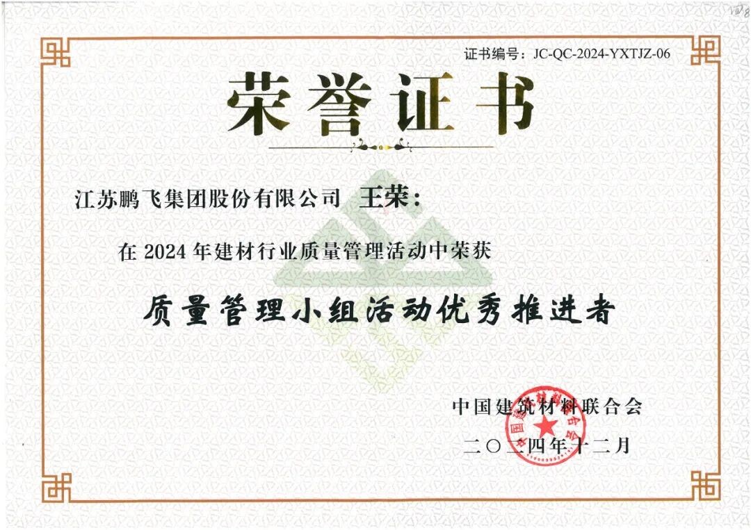 會(huì)議為2024年建材行業(yè)質(zhì)量管理活動(dòng)優(yōu)秀質(zhì)量管理成果、先進(jìn)個(gè)人和優(yōu)秀組織,2024年建材行業(yè)質(zhì)量管理活動(dòng)“我最喜愛的質(zhì)量管理小組”和“我最喜愛的質(zhì)量信得過班組”,以及2024年度建材行業(yè)“三品”典型案例的獲得者頒發(fā)證書。鵬飛多項(xiàng)成果榮獲佳績(jī)。